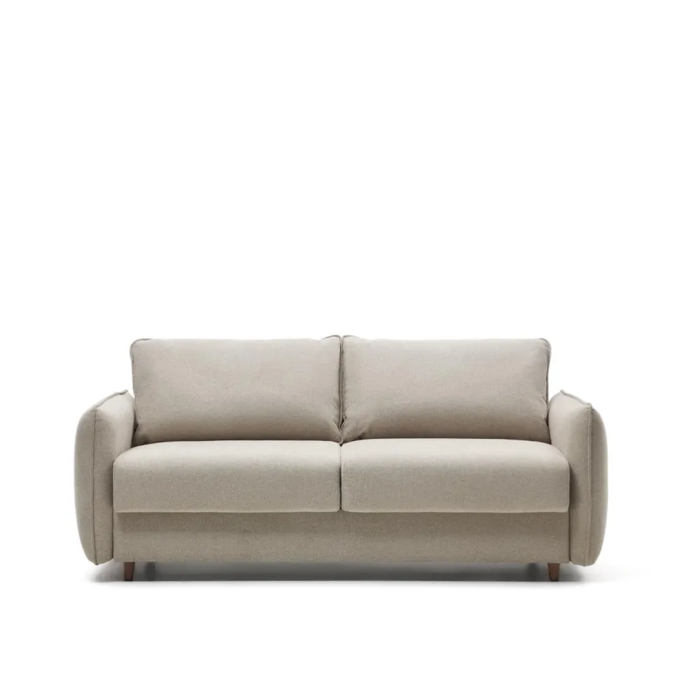 - Slaapbank met bekleding van een gestructureerde beige stof met hoge slijtvastheid die machinewasbaar is. Massief beukenhouten poten. Zitting en rugleuning met afneembare hoezen.