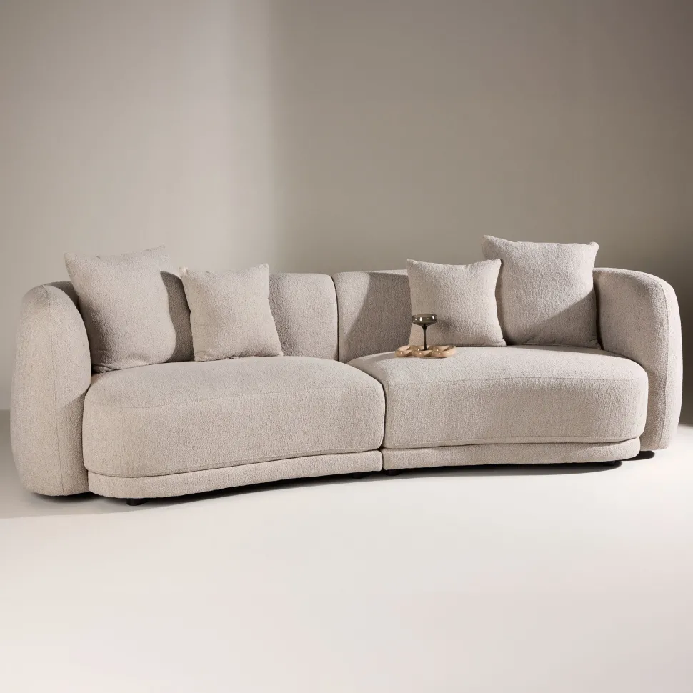 Creëer een verfijnde en uitnodigende sfeer in huis met de Macrina 3-zitsbank, bekleed met luxe beige bouclé materiaal. Macrina is een perfecte combinatie van modern design en ongeëvenaard comfort, waardoor het een centraal en elegant onderdeel van je woonkamer wordt. Het beige bouclé materiaal geeft de bank een unieke textuur en zachtheid die zowel exclusief oogt als aanvoelt. Deze tijdloze tint past naadloos in verschillende interieurstijlen, van minimalistisch tot Scandinavisch of meer eclectisch, en voegt een gevoel van warmte en stijl toe aan de kamer. Macrina is ontworpen met royale zitkussens en een comfortabele rugleuning die uitnodigt tot lange momenten van ontspanning. Deze 3-zitsbank is perfect voor zowel sociale bijeenkomsten als rustige momenten en biedt omhullend comfort dat van elke zit een plezier maakt. Met zijn elegante ontwerp en luxueuze beige bouclé materiaal is de Macrina 3-zitsbank meer dan alleen een zitmeubel – het is een pronkstuk dat de stijl van je huis verheft. Laat Macrina een natuurlijk middelpunt worden in je woonkamer, waar comfort en moderne elegantie elkaar ontmoeten.