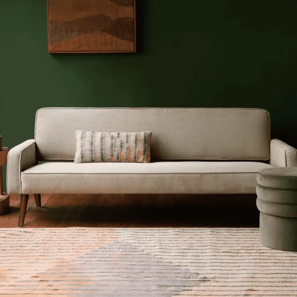 Met de Dutchbone Preston haal je dat fijne retro gevoel in huis, maar dan wel met een moderne twist. Deze slanke bank is bekleed met een prachtige ribstof, die de slanke lijnen van de bank extra accentueert. Het bijzondere aan deze bank is de ruimte tussen de rugleuning en zitting. Dit maakt het design luchtig en zorgt tegelijkertijd voor een karakteristieke look. De kegelvormige pootjes in walnootkleur maken de look af en geven een heerlijk warme sfeer af. Perfect om de ruimte mee om te toveren tot een knusse plek om samen te komen met vrienden en familie – a place to warm your soul.