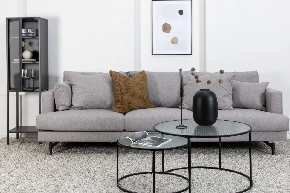 Een zwarte droombank die luxe en stijl uitstraalt! De Tamora bankenserie combineert elegante designtaal, strak Scandinavisch design met een charmante indruk die een uitnodigende blikvanger creëert. De smalle metalen botten geven deze 3-zitsbank een slimme en decoratieve lift waardoor je er gemakkelijk onder kunt stofzuigen. Geef je tijd voor ontspanning – gezellig met het gezin of verspreid je alleen! Afmetingen bank: Breedte: 255 cm, diepte: 56 cm, hoogte: 66 cm.