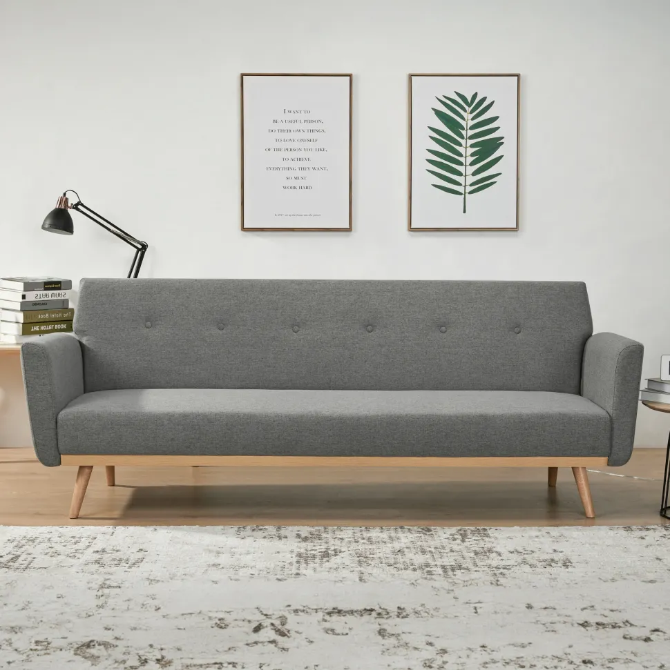 De 3-zits slaapbank wordt gepresenteerd in een stijlvolle, fijne structuurstof in zwart en stevige massief houten poten. Door de vouwfunctie van de rugleuning kan de bank snel worden omgebouwd tot slaapbank. Het massief houten frame zorgt niet alleen voor een stevige stand, maar biedt ook een geweldig contrast met de stoffen bekleding. De bekleding gaat helemaal rond en de rug is echt. De bekleding en de zit- en ligfunctie zorgen voor een aangenaam zit- of ligcomfort van een klasse apart. Het knoopstiksel op de rugleuning is een bijzonder hoogtepunt. Dit designjuweeltje wordt niet alleen een visueel hoogtepunt in je huis, maar ook je nieuwe plek van welzijn.