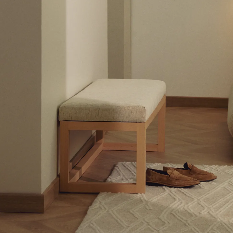 - Bankje bekleed met beige chenille en beukenhouten structuur.