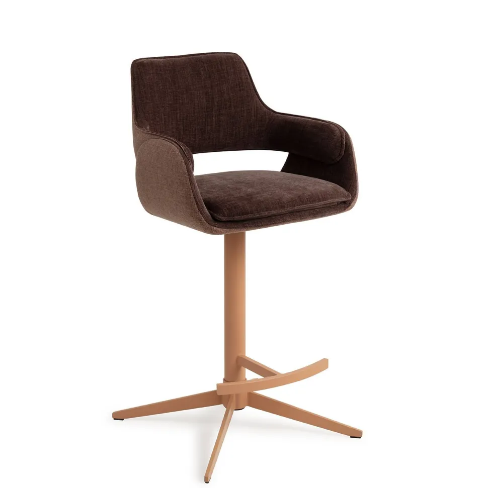 Upgrade je eetervaring met de Oketo barkruk, voorzien van tweedelige bekleding in verschillende stoffen, gecombineerd met een bijpassend gepoedercoat frame. Het frame heeft een 360 graden draaifunctie met automatische terugkeer.