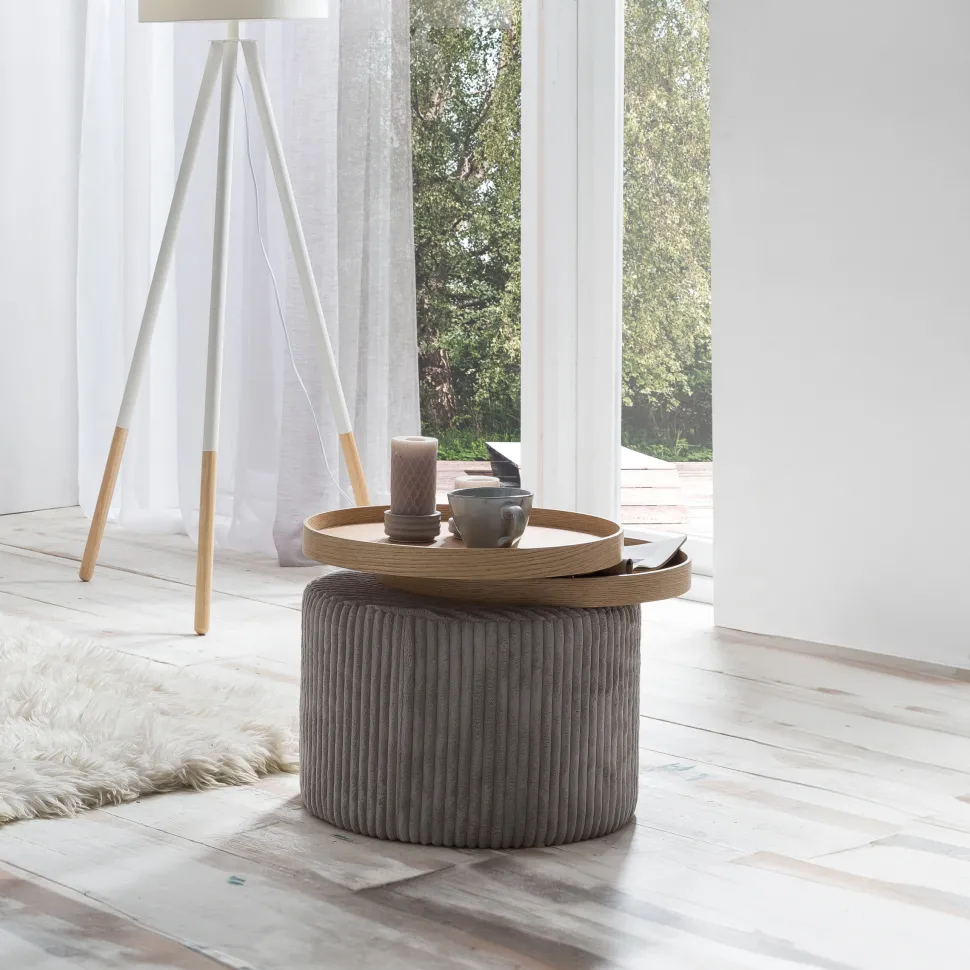 De bijzettafel overtuigt door een combinatie van stof en hout. Het onderstel van de bijzettafel is gemaakt van MDF en is bekleed met textuurstof. De twee draaibare tafelbladen zijn eveneens van MDF en bekleed met eikenfineer. Ze bieden voldoende opbergruimte en kunnen naar binnen of naar buiten worden gedraaid. Het juweeltje springt onmiddellijk in het oog, vooral door zijn unieke vormgeving, maar praktische doeleinden zijn hier bij de productie niet uit het oog verloren. Het oppervlak is zeer gemakkelijk schoon te maken en slijtvast. Klein vuil kan worden verwijderd met een licht vochtige doek.