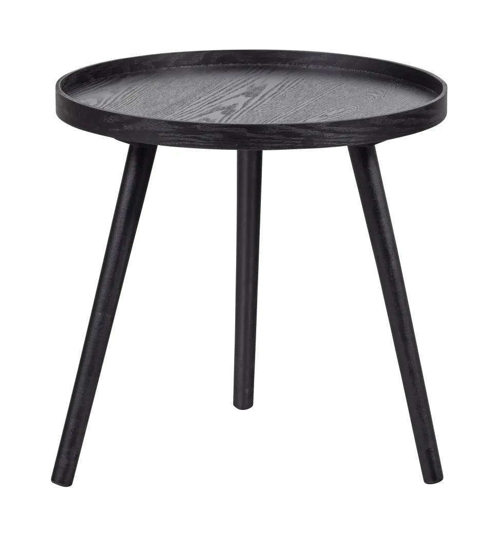 Met de Mesa bijzettafel van het Nederlandse merk WOOOD haal je een tijdloos item in huis. Mesa is vervaardigd uit massief grenenhout met een matzwarte aflak. De tafelrand heeft een dikte van 3 cm en staat iets hoger dan het tafelblad. De drie poten lopen iets uit, wat zorgt voor een stabiele stand.