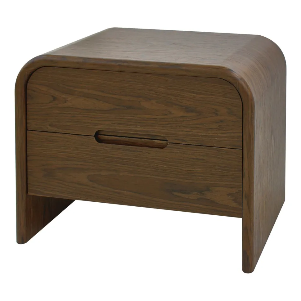 Deze bijzettafel heeft een compact en gesloten silhouet met rechte lijnen. Het ontwerp toont twee geïntegreerde lades, wat zorgt voor een rustige en overzichtelijke uitstraling. De warme bruintint past goed binnen verschillende interieurs.