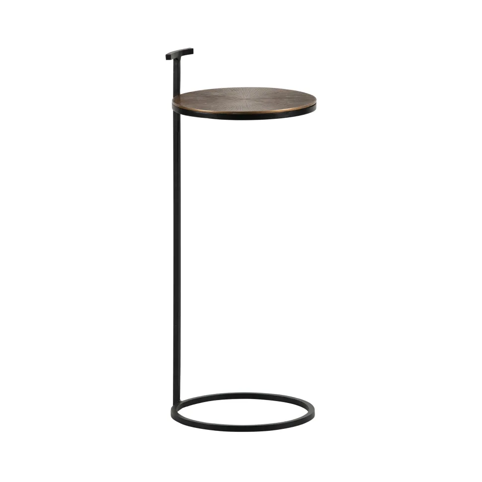 De tafel (hxb) 64xØ26 cm is gemaakt van een combinatie van ijzer en aluminium en heeft een antique brass afwerking. Het blad is 1,5 cm dik, de hoogte van de grond tot het blad is 56 cm. Het blad heeft een Ø van 25 cm. Tafel Position heeft een max. draaggewicht van 2 kg.
