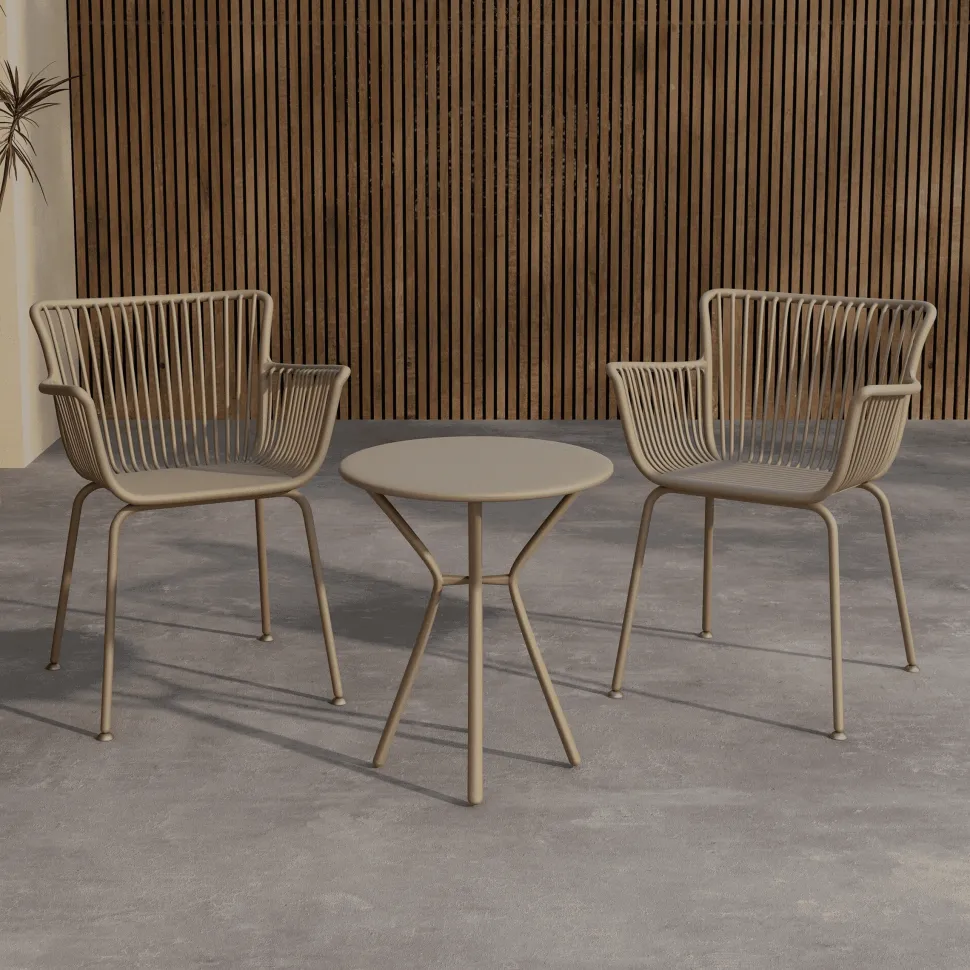 Maak een gezellige plek voor je ochtendkoffie of een relaxmomentje in de zon met de Quanette caféset in warm, zacht beige. De set heeft twee comfortabele stoelen met een uitnodigend ontwerp en een ronde tafel met strakke lijnen – perfect voor op het balkon, terras of in de tuin.