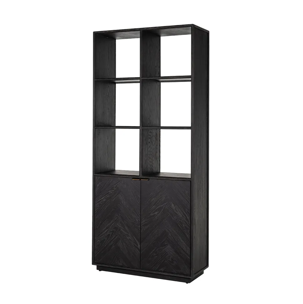 Boekenkast Blackbone Brass van Richmond Interiors combineert moderne luxe met een stoere uitstraling. Het zwart gebeitste eikenfineer is gelegd in een elegant visgraatpatroon dat diepte en dynamiek toevoegt. Het ranke metalen frame in warme messingkleur geeft de kast een verfijnde glans en een eigentijdse touch. Be boekenkast Blackbone Brass heeft een imposante maar toch luchtige aanwezigheid. De zes open vakken zijn ideaal voor boeken en decoratie, terwijl de twee deuren met extra plank verborgen opbergruimte creëren. Een stijlvol statement dat iedere ruimte karakter en allure geeft.