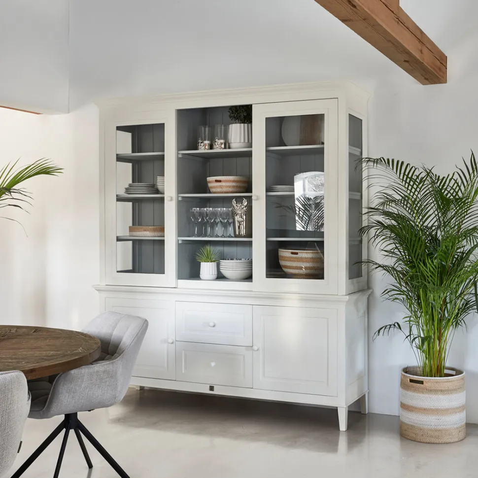De Bedford Cabinet is nu ook in deze tweedelige XL-variant verkrijgbaar. Ook deze extra grote en brede buffetkast is gemaakt van mangohout en gecoat in twee kleuren: crème en grijs. In tegenstelling tot de smallere Bedford Cabinet is de XL-variant aan de binnenkant grijs en aan de buitenkant crèmekleurig. Dankzij de softclose deuren kun je deze altijd geruisloos openen en sluiten.