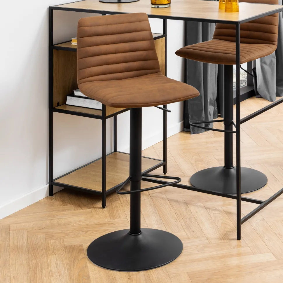 Een rechttoe rechtaan ontwerp met eenvoudige lijnen, waardoor een moderne barkruk met vierkante zitting is ontstaan. De zitting is bekleed met een zachte camelkleurige microvezelstof met een speciale coating en versierd met horizontale stiksels. Hij staat op een zwarte trompetdraaivoet die bijdraagt aan de algehele moderne allure.