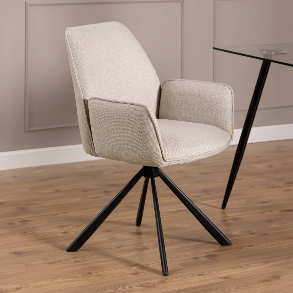 De eetkamerstoel verheft elke eetkamer met zijn eigentijdse silhouet en is versierd met een beige stof met een tweekleurig effect en een biesdetail, wat de stoel een getextureerde look geeft. Aangevuld met het zwarte stalen onderstel met 4 sterren en een draaifunctie, combineert de stoel stijl en functionaliteit en weerspiegelt daarmee het moderne tijdperk.