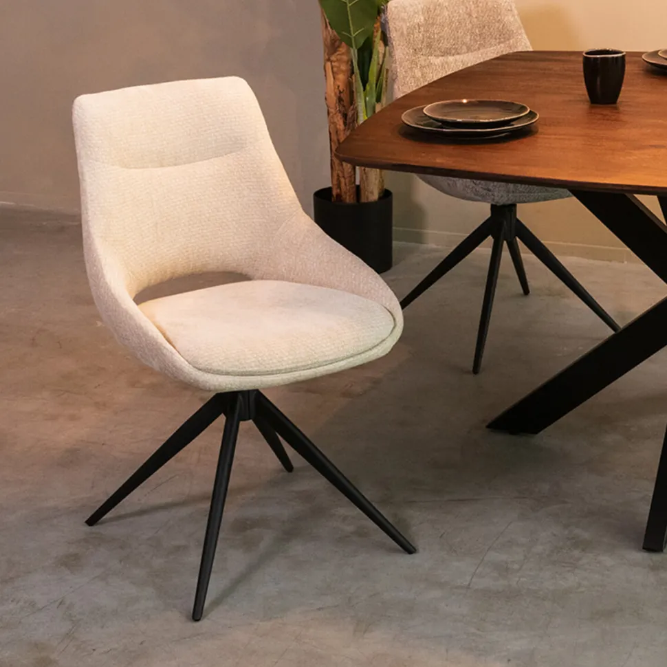 Deze eetkamerstoel biedt meer dan alleen een mooi uiterlijk. Het ergonomische ontwerp met een gebogen rugleuning biedt optimale ondersteuning tijdens lange diners of gezellige avonden aan tafel. De zitting is breed en comfortabel, en de draaibare functie maakt de stoel bijzonder functioneel. De slanke, metalen poten zorgen voor een stabiele basis en geven de stoel een moderne uitstraling zonder massief te ogen.