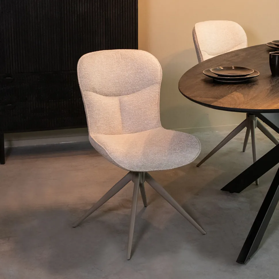 Eetkamerstoel Thorben is draaibaar, en voorzien van een automatic return systeem, waardoor je eenvoudig in alle richtingen kunt bewegen, en de stoel na gebruik weer netjes terugdraait naar zijn originele positie. Bovendien zijn de poten uitgevoerd in taupe metaal, waardoor deze stoel perfect past in een Scandinavisch of Japandi interieur.