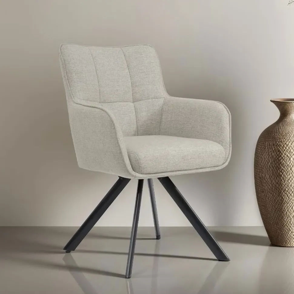 De Tori eetkamerstoel brengt modern design en zitcomfort mooi samen. De zachte bekleding en de gevormde rugleuning geven de stoel een warme en uitnodigende uitstraling. De zitting met pocket springs zorgt voor een heerlijk comfortabele en ondersteunende zit, perfect voor lange diners. Dankzij het 180° draaibare onderstel geniet je van extra flexibiliteit en gemak. Met de Tori draaistoel haal je niet alleen een praktisch meubelstuk in huis, maar ook een subtiele blikvanger die elke ruimte een verfijnde uitstraling geeft. Ontdek de perfecte combinatie van design en comfort!