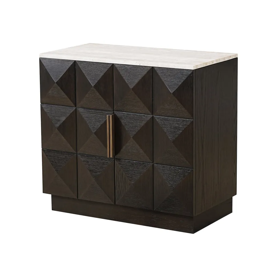Het Claremont dressoir is een stijlvol meubelstuk, vervaardigd uit eikenfineer, eikenhout, travertine en hout. Het dressoir beschikt over vier deuren met een opvallend geometrisch patroon, wat zorgt voor een moderne en karaktervolle uitstraling. Het stevige bovenblad van steen voegt een luxueus en duurzaam element toe aan het ontwerp. Met voldoende opbergruimte achter de deuren is dit dressoir zowel praktisch als een visueel statement in elke woonruimte.