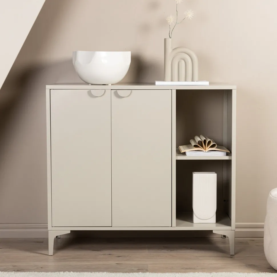 Een dressoir in een warme kleur is een stijlvolle en slimme oplossing voor je huis! Het Danyella dressoir heeft een klassiek industrieel ontwerp van beige gepoedercoat staal. Het heeft twee deuren voor verborgen opbergruimte en twee open planken – perfect om elegante decoraties en design details te laten zien. De slanke poten tillen de kast op, waardoor hij er luchtig uitziet en je er makkelijk onder kunt schoonmaken.
