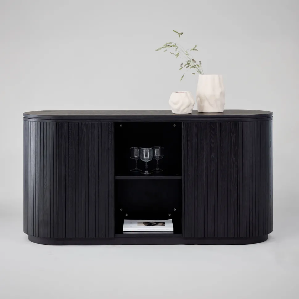 Een ovale reliëfkast die zowel zichtbare als verborgen opbergruimte biedt! Deze boomvaste kast uit de Elouise serie behoort tot de wind collectie en heeft een slank, Scandinavisch ontwerp dat de aandacht trekt! Hij is gemaakt van zwart eikenhout met fineer en heeft kastjes voor verborgen opbergruimte en twee open planken die uitstekend geschikt zijn voor wat mooie interieurdetails of kleine kaarsen. Verhoog het stijlniveau in je huis met een trendbestendige opbergkast die de tijd doorstaat!