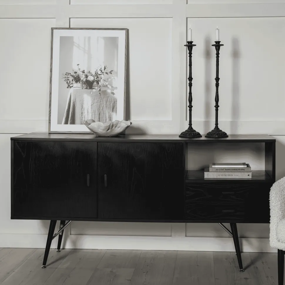 Frisco Opbergmeubel – Zwart Fineer – Zwarte Poten – Messing Details