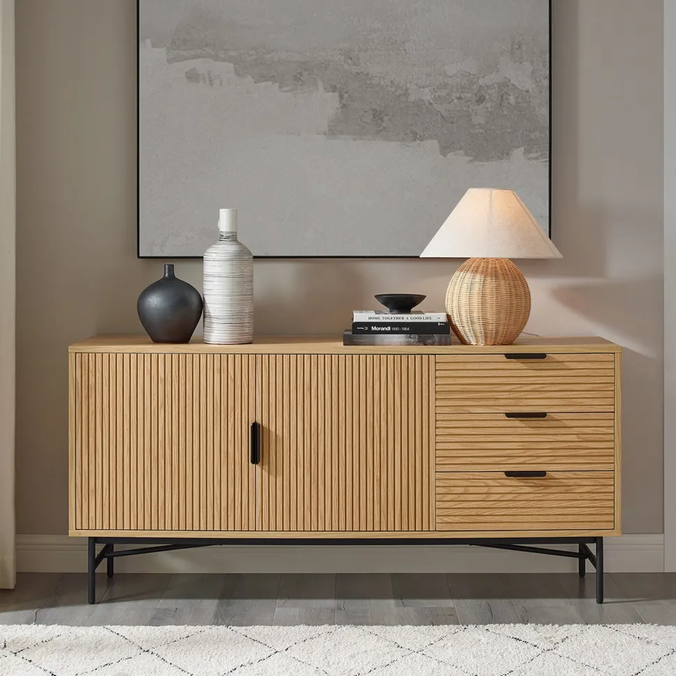Licht eiken echt houtfineer en hoge, zwart gelakte poten zorgen niet alleen voor moderne contrasten, maar brengen ook de trendy Scandi-stijl in je eigen huis. De krasbestendige PU-lak op de romp van het meubel maakt het bijzonder bestendig en duurzaam, zodat je lang van je meubelstuk kunt genieten. Het frame met de filigraanpoten zorgt voor een luchtige, lichte uitstraling en een modern loftkarakter. De paneellook van het eikenfineer zorgt voor dat bepaalde visueel iets. In dit dressoir bieden 2 deuren en 3 laden veel ruimte en gesloten opbergruimte – voor gemakkelijk meer orde in de woonruimte.