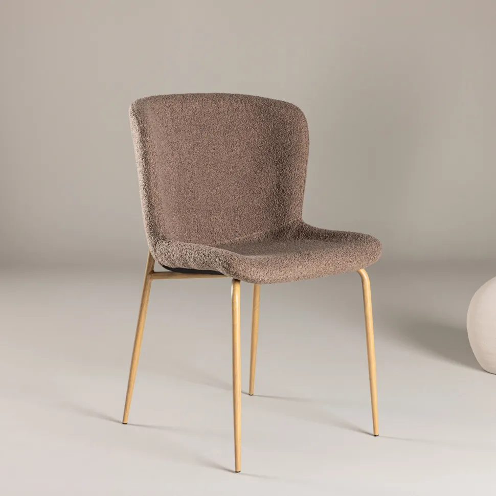 Ontdek de Artesha eetkamerstoel – een trendy en opvallend meubelstuk dat een warme sfeer brengt in je eetkamer. De zitting van de stoel is bekleed met een gezellig teddy materiaal in een elegante bruine kleur, terwijl de poten gemaakt zijn van staal en een prachtige mokkatint hebben.