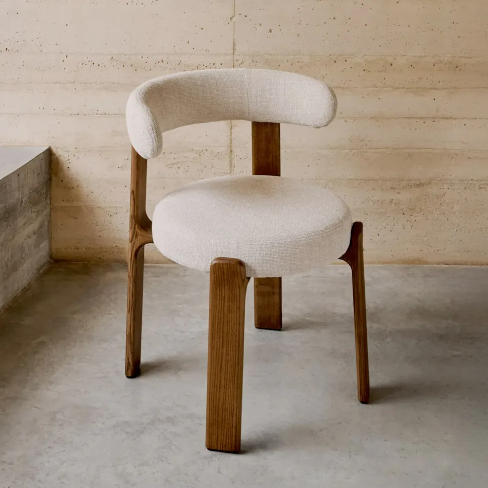 - Stoel bekleed in chenille met gerecycled polyester met een grove structuur in tweekleurig beige.