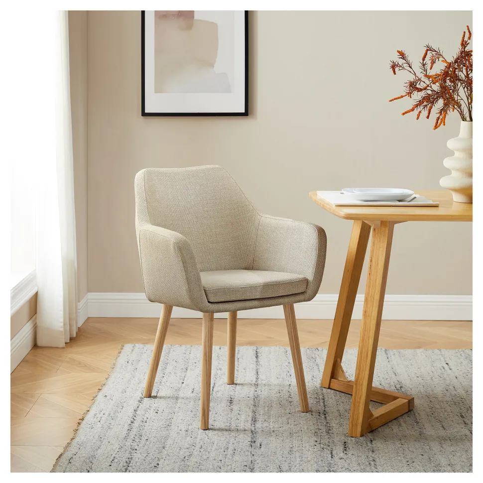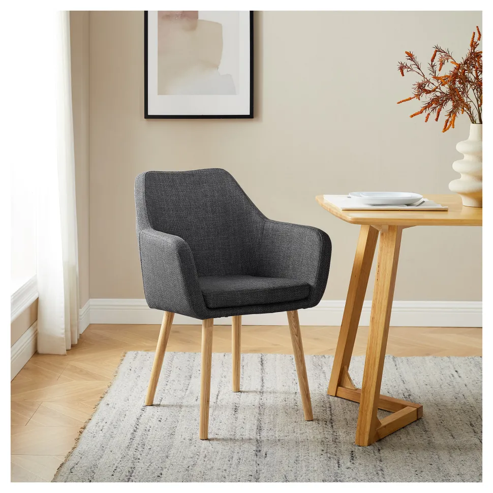 Tijdloze schoonheid met Scandinavische flair: deze fauteuil met een bekleding van structuurstof slaat in veel inrichtingsstijlen een goed figuur. Het gestructureerde oppervlak van de Oeko-Tex-gecertificeerde en PFC-vrije stof geeft de hoes een driedimensionaal en gemêleerd effect. Robuuste poten van massief eiken maken de Scandinavisch-chique uitstraling compleet. De hoge armleuningen en het gestoffeerde zitkussen zorgen voor optimaal zitcomfort. Onze tip: Combineer twee kleuren stoelen samen aan de eettafel. Dit creëert een interessante en vrolijke sfeer.