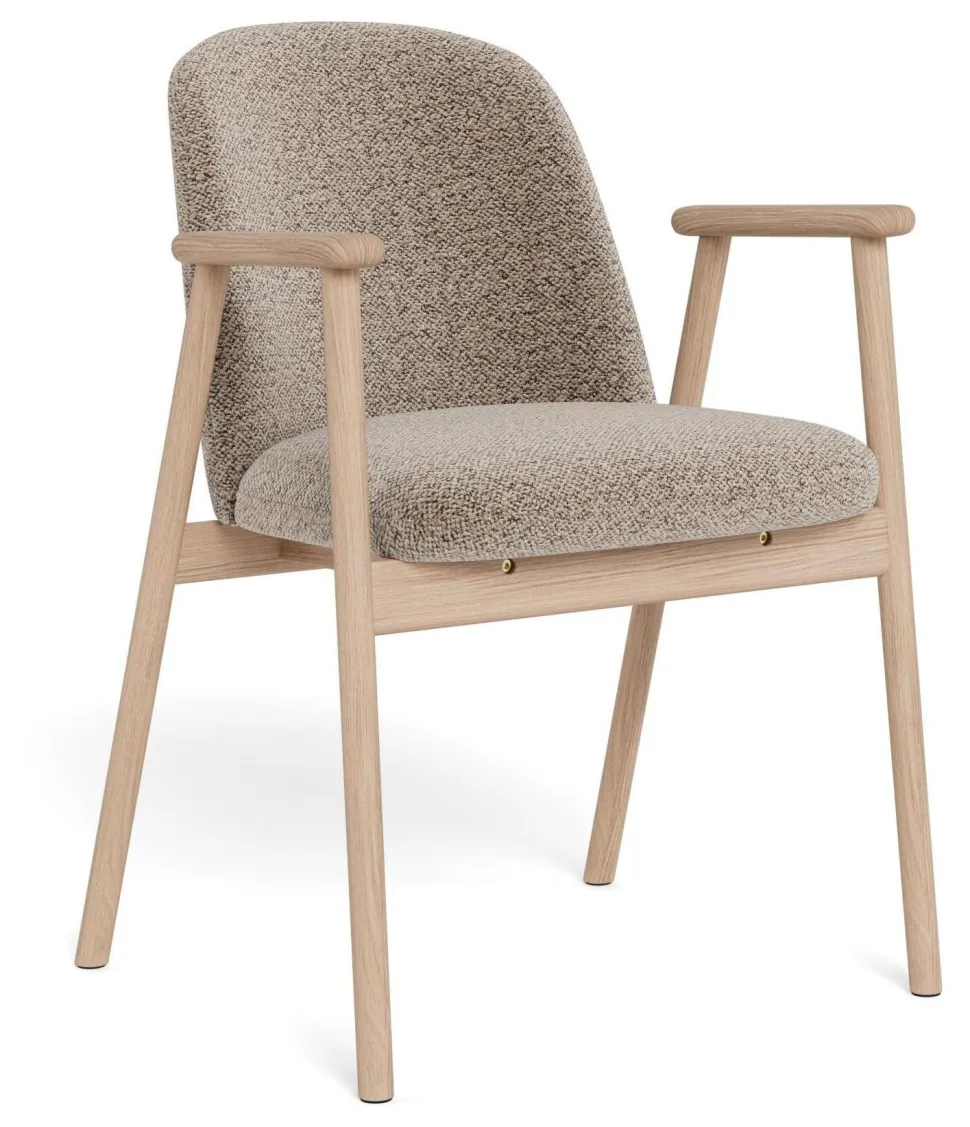 Deze eetkamerstoel met armleuningen geeft je eetkamer een Scandinavische elegantie. De zitting is bekleed met een beige bouclé-stof met een luxe gekrulde structuur voor een moderne, maar toch elegante uitstraling. De stoel heeft een sculpturale look dankzij de slanke poten en het eikenhout maakt het geheel helemaal af.