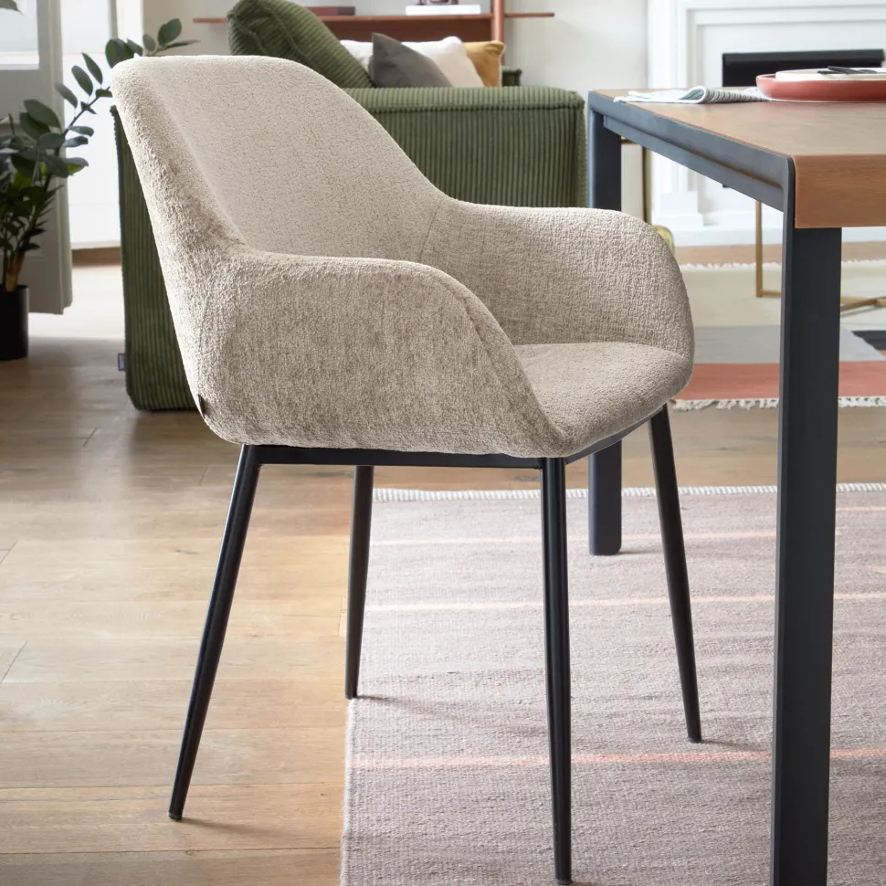 Tafel na op de heerlijke Konna eetkamerstoelen van Kave Home. De collectie van dit Spaanse merk geeft echt karakter aan jouw interieur en dat is zeker terug te zien in deze prachtige stoel. De eetkamerstoel is bekleed met een zachte chenille stof waar je heerlijk in kunt zitten. Deze stof heeft een warme uitstraling. De armleuningen bieden nog eens wat extra steun bij lange avonden natafelen.