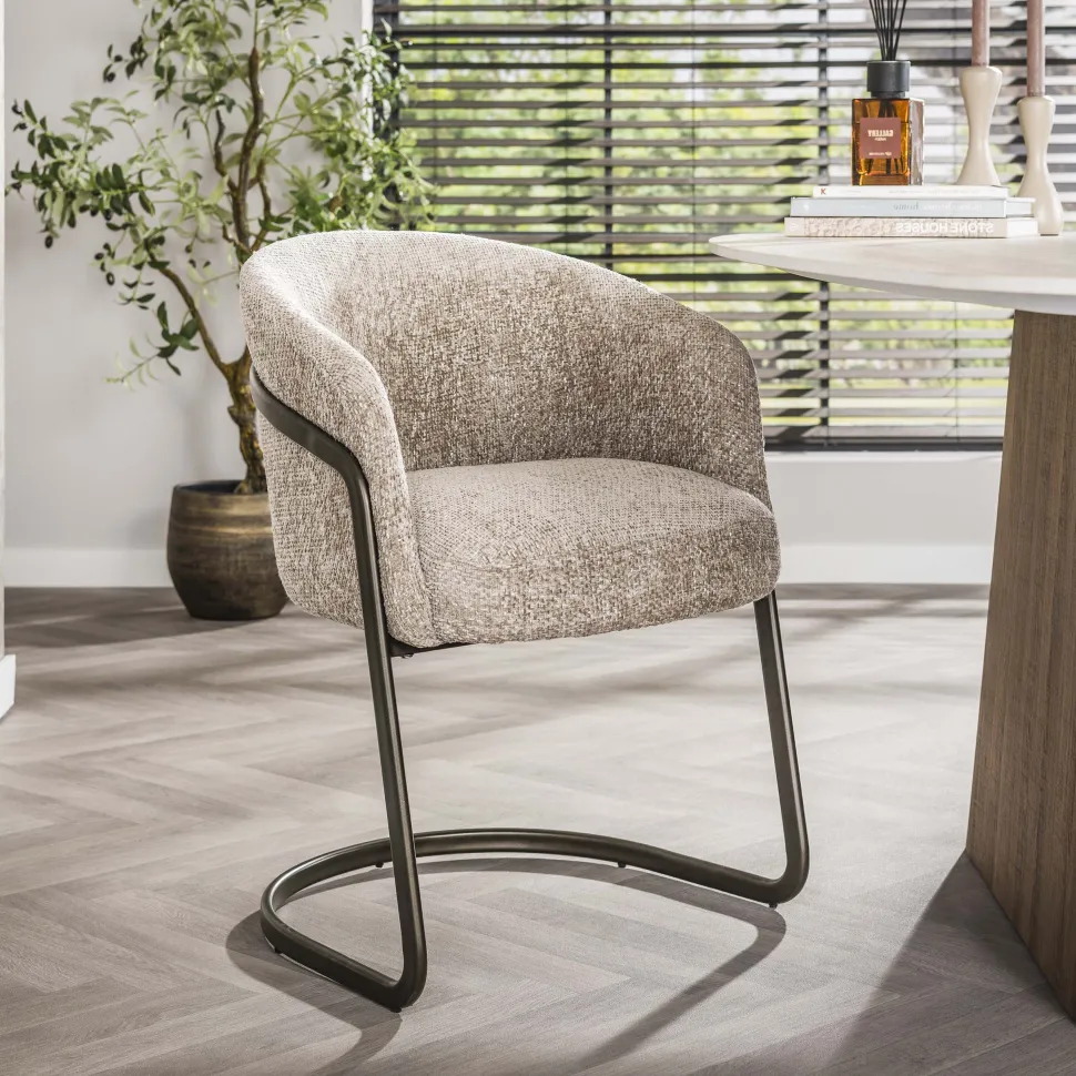 Armstoel Sway is voorzien van een comfortabele zitting met pocketvering en is beschikbaar in verschillende stofferingen. Het model heeft een modern swing frame van bronskleurig metaal.