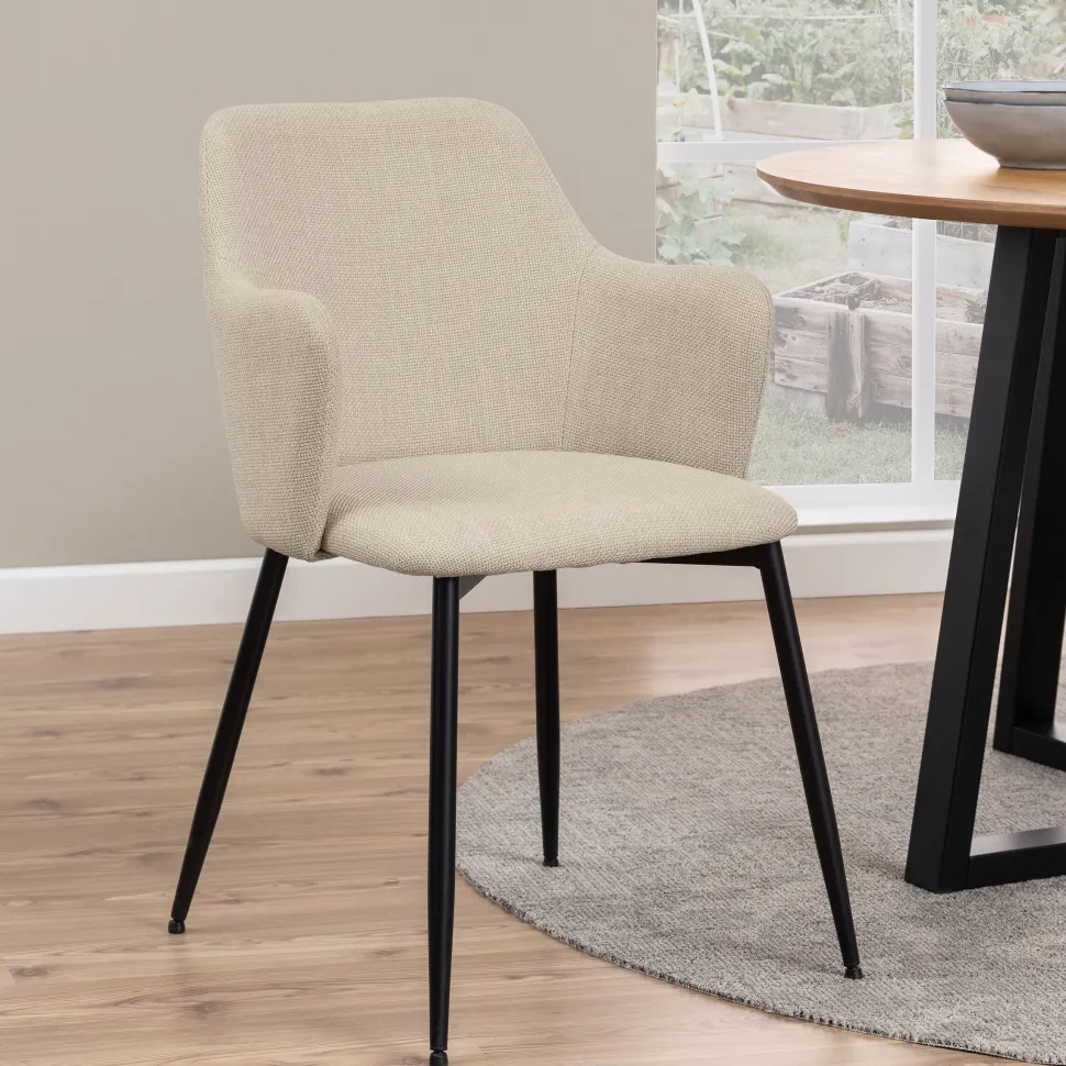 Door speelse lijnen en een omarmende vorm brengt deze beige eetkamerstoel karakter in je eethoek. Merk op hoe de schuine armleuning de stoel een stoere vibe geeft. Ondersteund door ronde gepoedercoate metalen poten kun je stijlvol en comfortabel van je maaltijd genieten.