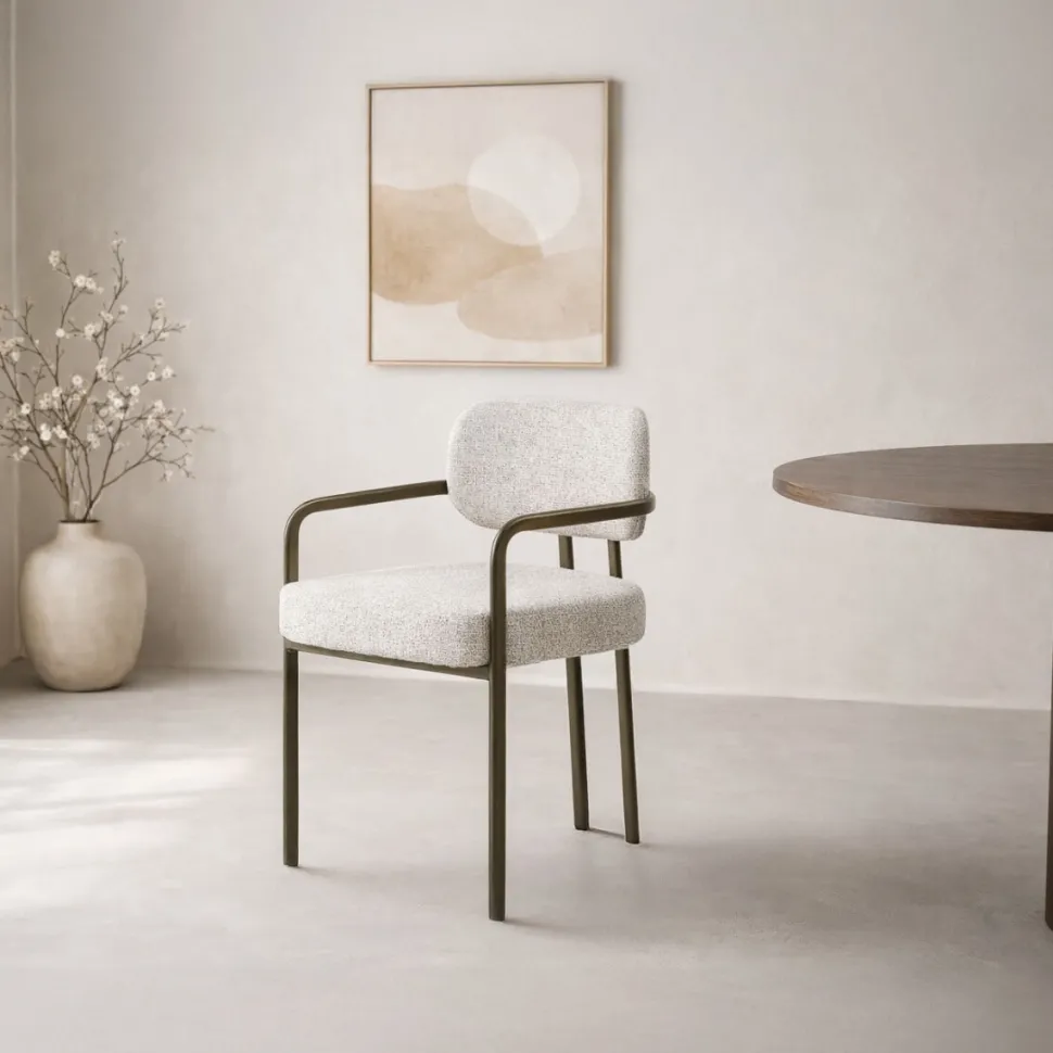 Armstoel Milan combineert verfijnd comfort met een minimalistische uitstraling. De zachte, rijk beklede zitting met pocket springs en hoge rugleuning zorgen voor veerkrachtige ondersteuning en extra comfort. Het slanke metalen frame en de rustige lijnen geven de stoel een tijdloos karakter. Dankzij de natuurlijke uitstraling en subtiele vormgeving past Milan perfect binnen een Japandi interieur, maar voelt hij zich net zo thuis in een modern of warm eigentijds interieur.