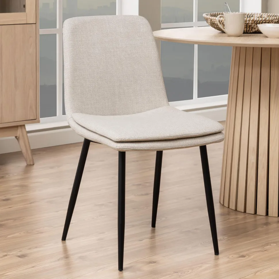 Een gestroomlijnd silhouet heeft zijn eigen charme, maar als je een opgenaaide laag op de zitting toevoegt, krijg je ineens een vernieuwde stijl die elke eetkamer flatteert. Het tweekleurige effect van de gestructureerde beige bekleding vergroot de visuele diepte van de stoel. Ondersteund door slanke zwarte metalen poten biedt deze moderne stoel een mix van elegantie en veelzijdigheid.