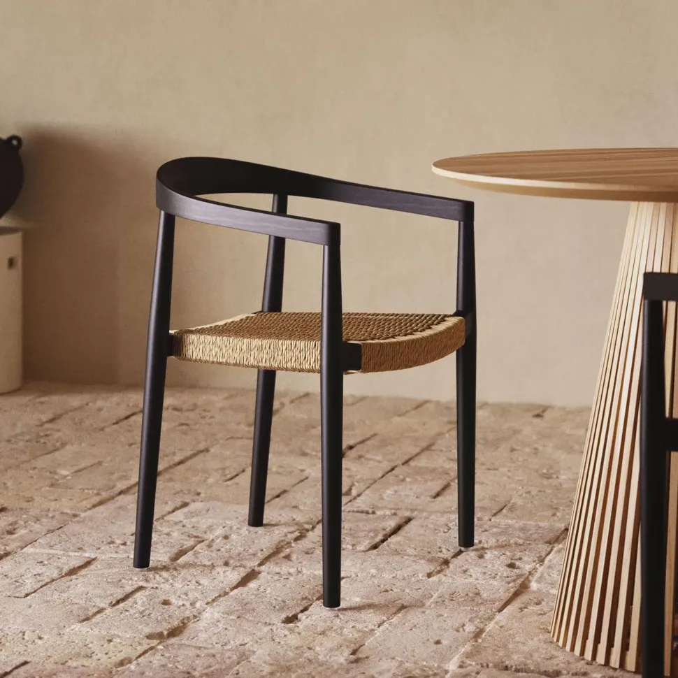 - Stapelbare stoel met armleuningen van natuurlijke materialen.
