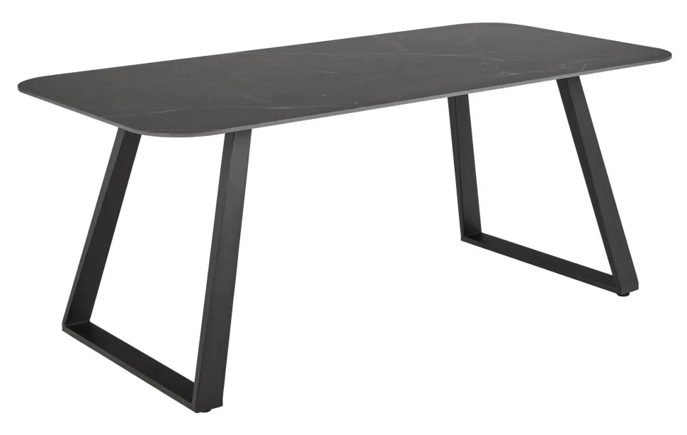 Deze veelzijdige tafel verankert de eetkamer met zijn moderne stijl en is geschikt voor elke gelegenheid, van creatieve middagen met de kinderen tot weekendbrunches. Het rechthoekige keramische blad met afgeronde hoeken is hitte- en krasbestendig en rust op een zwart stalen sledeonderstel voor visuele belangstelling. Hij biedt comfortabel plaats aan 6 personen.