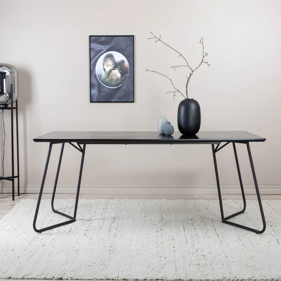 Mikella is even praktisch als tijdloos! Een doordringende zwarte eettafel met driehoekige tafelpoten van ijzer en een rechthoekig tafelblad van MDF. Het Scandinavische inspirerende ontwerp met smalle vormgeving en licht uitlopende poten geeft een luxe en stijlvolle indruk aan de woonkamer. Combineer met een paar heerlijke eetkamerstoelen en geniet van gezellige maaltijden in het vooruitzicht!