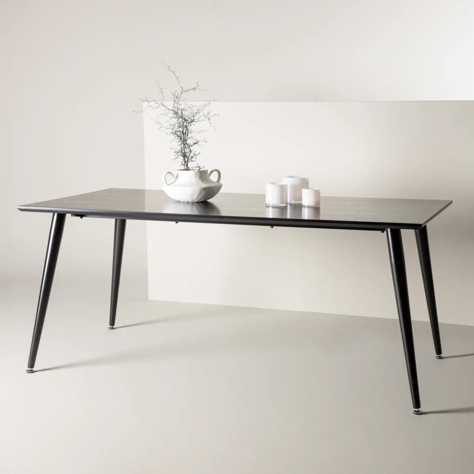 Eenvoudige en stijlvolle eettafel in elegante zwarte kleur met een MDF tafelblad en metalen ondergoed met messing poot. Dip is een flexibele eettafel die in de meeste omgevingen past en gemakkelijk te combineren is met andere inrichtingen. Zet je unieke stijl neer en match met eigenwijze of schattige stoelen. Nodig uit tot heerlijke diners!