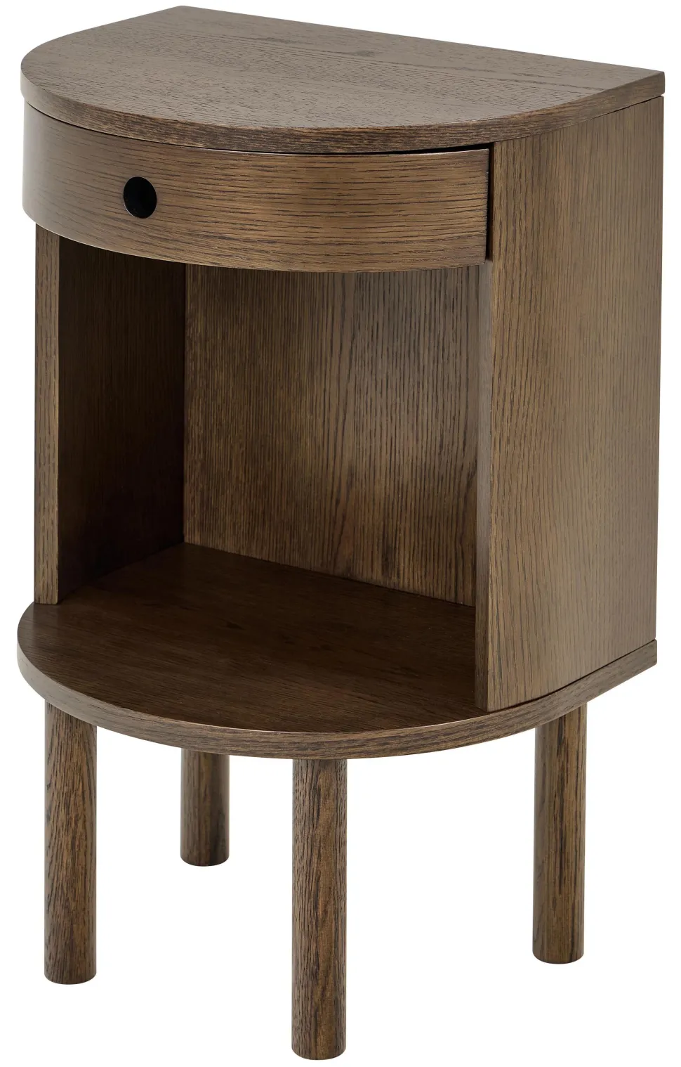 Dit nachtkastje valt op door zijn chique esthetiek, met een halfronde vorm en ronde poten. Het is voorzien van een lade en een open vak voor kleine benodigdheden en decor. Het gelakte eikenfineer accentueert het ontwerp van het tafeltje en benadrukt de natuurlijke uitstraling.