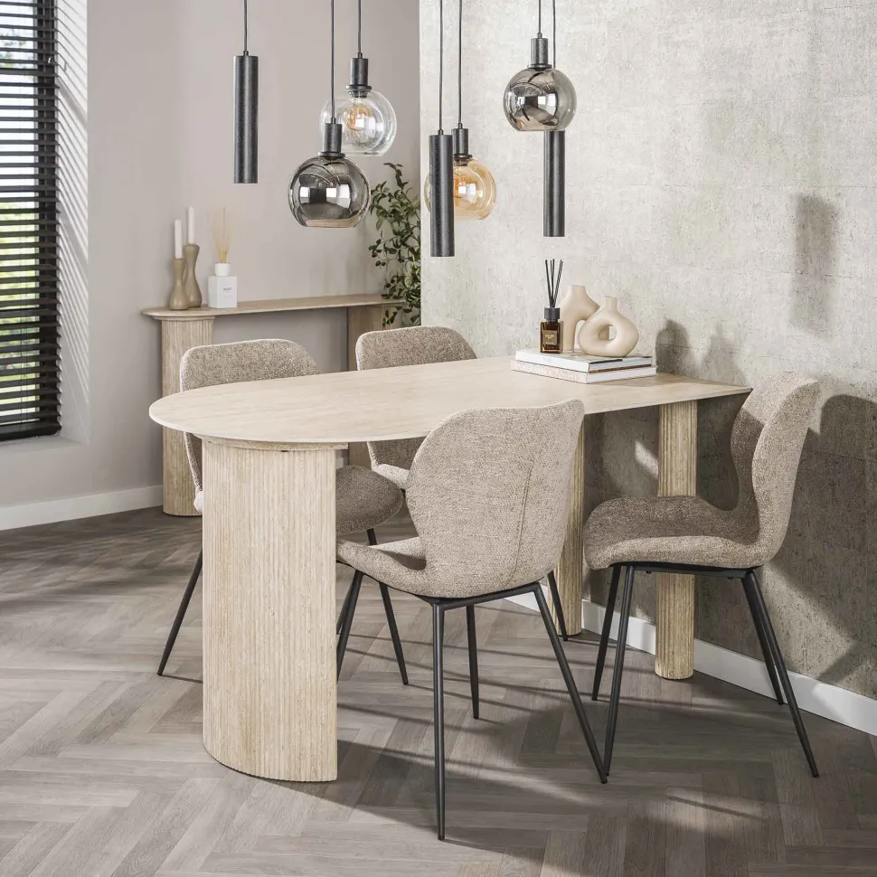 De halfronde eettafel Laycie van LifestyleFurn is compact, stijlvol en vol karakter. Het keramieken blad in travertinlook geeft een luxe uitstraling en voelt tegelijk duurzaam en makkelijk in onderhoud. Met een rechte zijde plaats je de tafel eenvoudig tegen de muur, ideaal voor kleinere ruimtes.