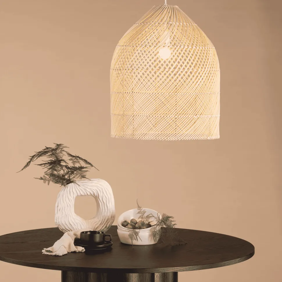 De plafondlamp Bambie heeft een klassiek ontwerp met een modern tintje! De lampenkap is rond en gemaakt van natuurlijk gekleurd riet, gevlochten in een mooi patroon. De lamp geeft een aangename gloed en voegt een warme en rustige sfeer toe aan de kamer. Plaats hem boven de eettafel en geniet van lange diners met familie of boven de salontafel voor gezellige filmavonden met ontspannend licht. Afmetingen: 53x45x45.