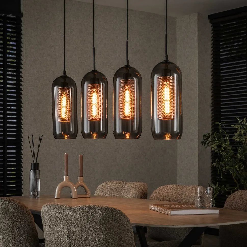 Deze hanglamp heeft vier mondgeblazen smoke glas kappen. Binnen deze kappen zitten vier cilindervormige koper mesh kappen verwerkt. Deze combinatie zorgt voor een trendy en chique uitstraling. Daarnaast wordt hierdoor het licht mooi gedoseerd door de ruimte verdeeld. De lamp is tot 150 cm in hoogte verstelbaar. Er wordt aanbevolen om LED lichtbron (8473) te gebruiken.