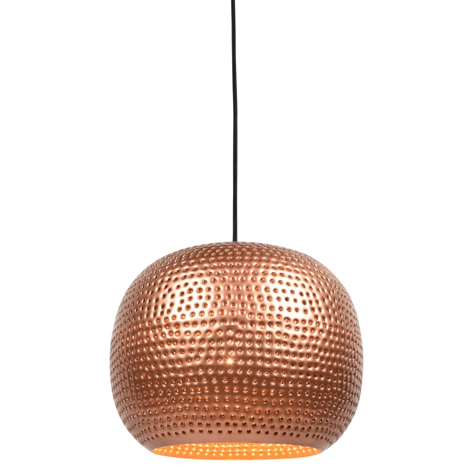 De hanglamp Spike is een leuke koperkleurige lamp. Het oppervlakte van deze lampen is met de hand voorzien van spijkergaten. Dit maakt ieder item uniek! Door de gaatjes geeft deze lamp een leuke sfeer. Deze hanglamp heeft een luxe uitstraling door het stoere stoffen snoer.