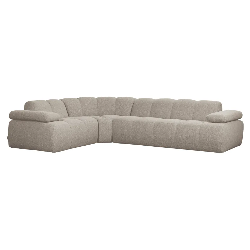 De Mojo hoekbank van WOOOD combineert comfort met een speelse uitstraling. De bank is bekleed met geweven Remy ribstof in een beige kleur, wat zorgt voor een zachte, uitnodigende sfeer in de woonkamer. De verticale stiksels geven de bank extra karakter en structuur.