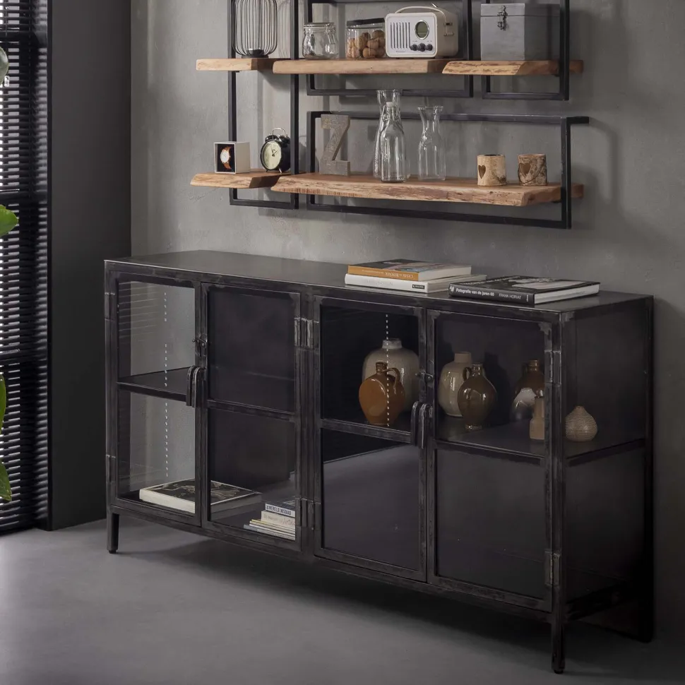 Industrieel Dressoir Rift Metal 180cm met 4 glazen deuren