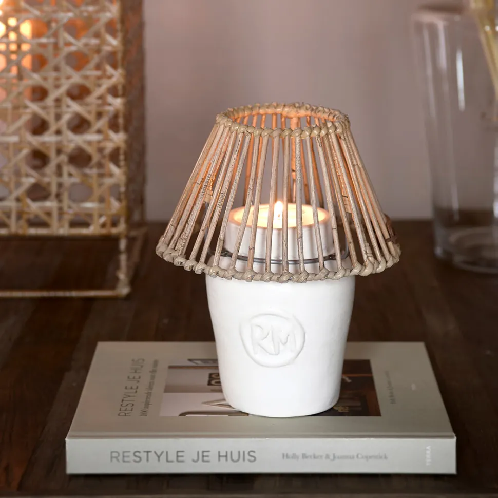 De kandelaar van dit originele waxinelichtje is handgemaakt van klei en draagt de RM initialen. Op het rattan dakje is het Rivièra Maison leren beeldmerk bevestigd. Deze RM Clay Candle Holder white is daarom een mooi cadeau.