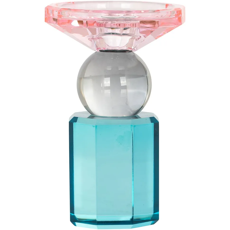 Kandelaar Michou is een fascinerend staaltje van vakmanschap en design. Deze kandelaar, vervaardigd uit glas, schittert met een verleidelijk blauw en roze kleurenspel dat de ruimte vult met een sfeervolle, bijna magische gloed wanneer er een kaars in wordt aangestoken.