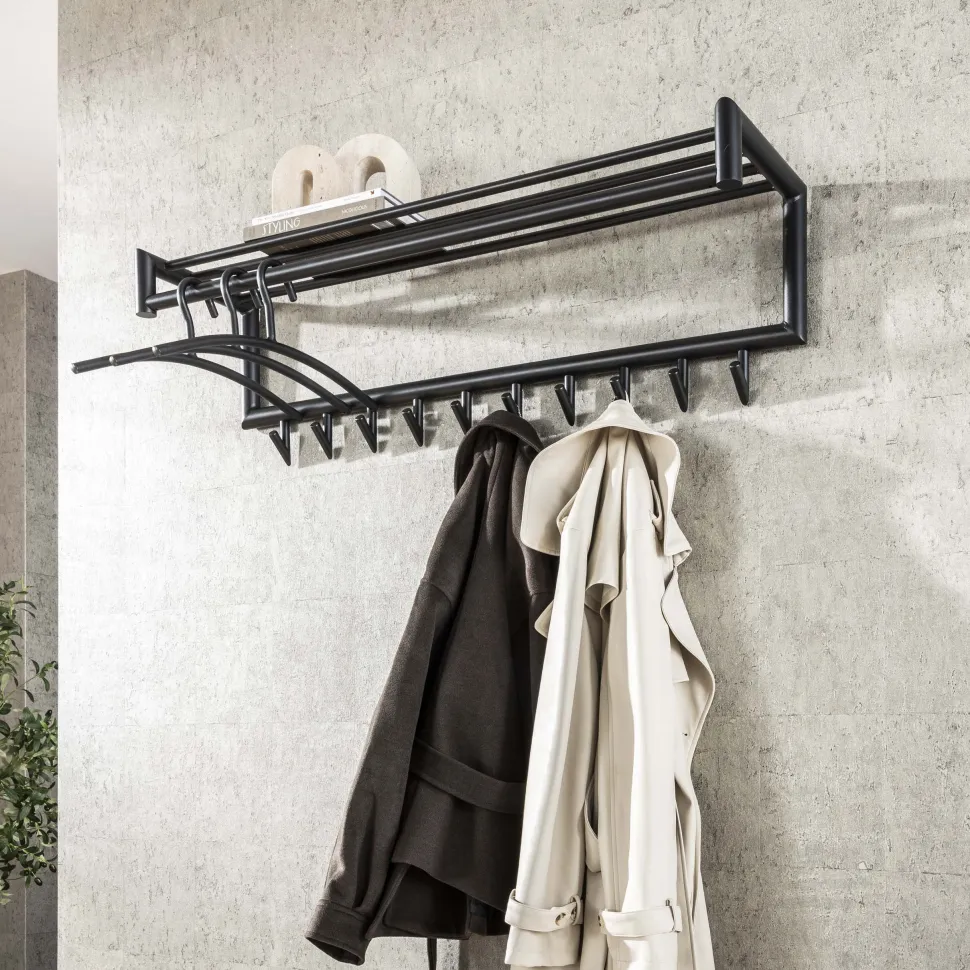 Tubo is een industriële wandkapstok van gepoedercoat staal met tien vaste haken, een roede en een hoedenplank. De haken zijn bruikbaar aan beide zijden en bieden ruimte voor jassen, tassen en accessoires. Het ronde buisontwerp is uitgevoerd in mat donkergrijs en geschikt voor hal, gang of entree. De kapstok wordt opgebouwd geleverd en is eenvoudig aan de muur te bevestigen via twee bevestigingsogen.