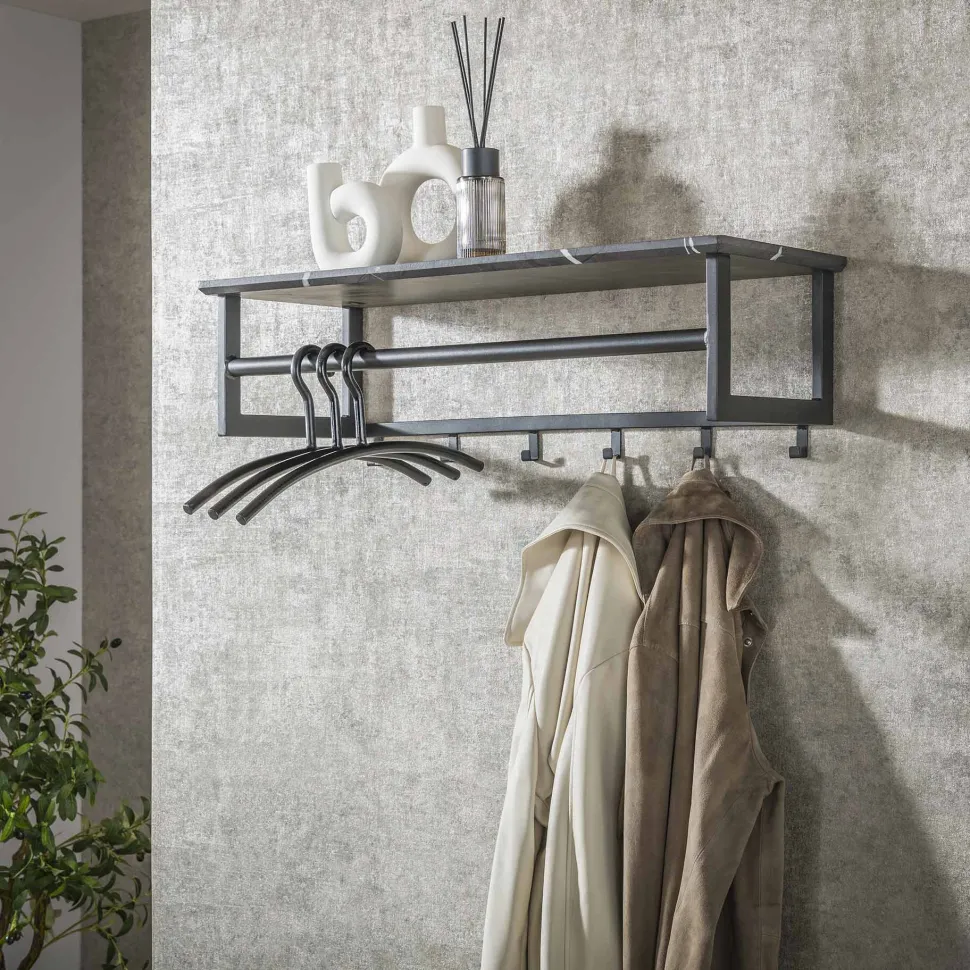 Tenaro is een wandkapstok van metaal, voorzien van een hoedenplank met melamine afwerking in natuursteenlook. Het model heeft zes haken, een roede voor kledinghangers en een bovenplank voor hoeden of accessoires. Montage aan de wand gebeurt eenvoudig via twee bevestigingspunten. Tenaro is onderdeel van de gelijknamige serie en ook leverbaar in een uitvoering met twaalf haken.