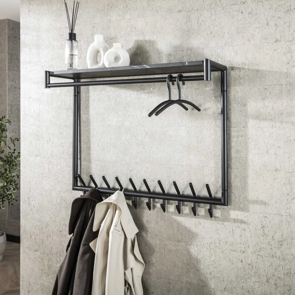 Tenaro is een wandkapstok van metaal met twintig haken, een roede en een hoedenplank met melamine afwerking in natuursteenlook. Het model wordt geleverd als knockdown constructie, waardoor het compact verpakt is en efficiënt te verzenden. Montage aan de wand gebeurt via twee bevestigingspunten. Tenaro is onderdeel van de gelijknamige serie en ook verkrijgbaar in een uitvoering met tien haken.