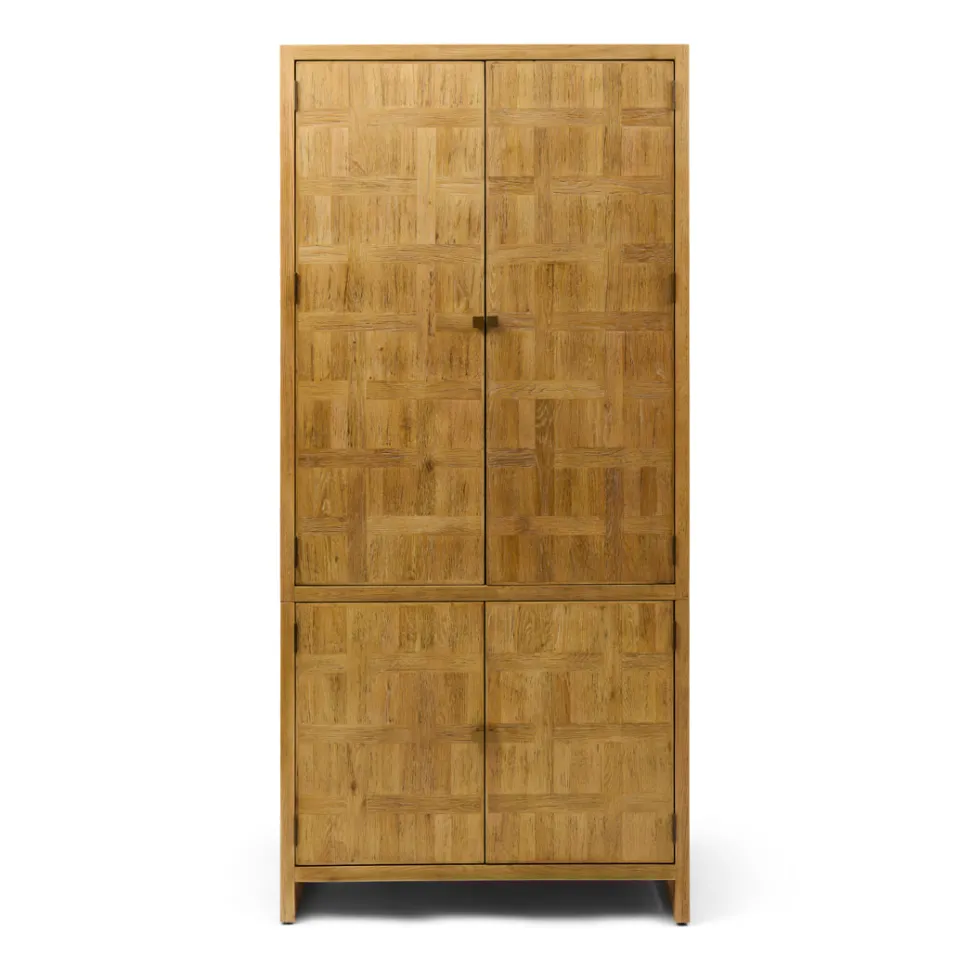 Ontdek de tijdloze schoonheid van de Fraser Island kledingkast, die natuurlijke elegantie combineert met praktische opbergruimte. Gemaakt van teruggewonnen eikenhout, benadrukken de zichtbare houtnerven de robuuste en warme uitstraling van deze kast. Met vier deuren, twee lades, een hanggedeelte over de volledige breedte en planken biedt de kast volop ruimte voor je kleding en accessoires. Dankzij de slimme indeling houdt de Fraser Island kledingkast je slaapkamer georganiseerd en stijlvol. Met afmetingen van 230 cm hoog, 110 cm breed en 60 cm diep is het een perfecte keuze voor een luxe uitstraling en ultiem gemak in je interieur.